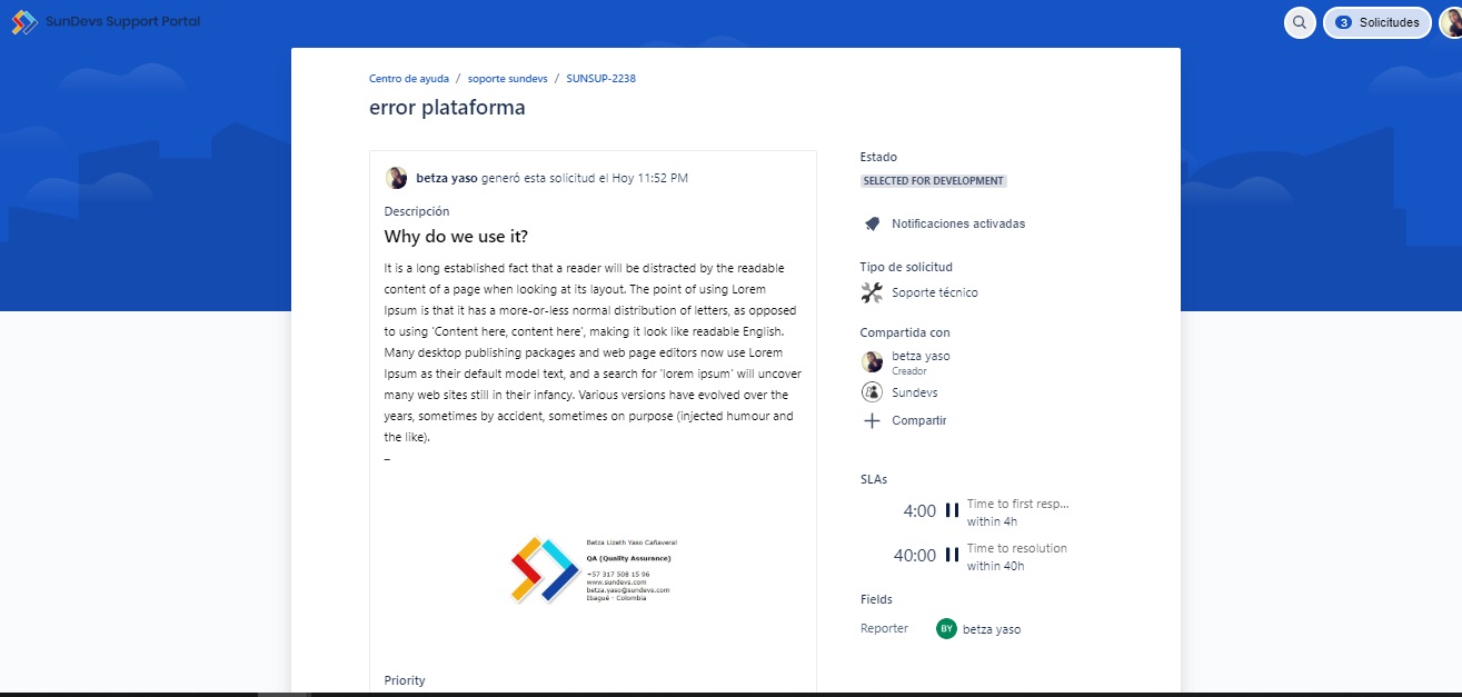 cuando se ingresa en un caso se puede ver toda la información de ello y no solo lo puesto por el usuario, también los SLA dispuestos para ese tipo de caso, la prioridad, los participantes en el caso y la opción de añadir comentarios.