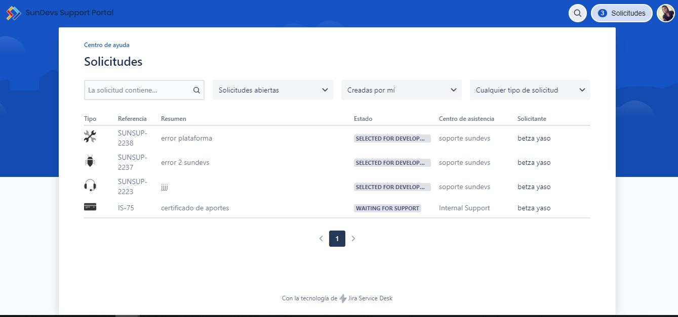 Una lista de casos abiertos con su usuario o en el cual es participante